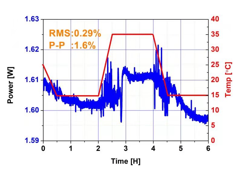 To solve this problem, PreciLasers products are equipped with a power stabilization function as standard. At room temperature, the peak-to-peak power stability is <1% (4 h). For applications with high and low temperature requirements, the peak-to-peak power stability is <3% at 15-35°C.